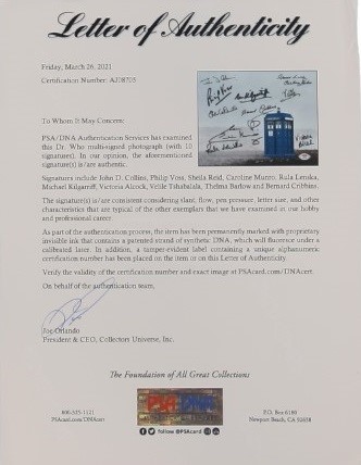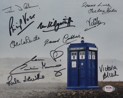 8 x 10 shot from “Doctor Who” TV Show signed in person by Victoria Alcock, Thelma Barlow, John D. Collins, Bernard Cribbins, Michael Kilgarriff, Rula Lenska, Caroline Munro, Sheila Reid, Velile Tshabalala, and Philip Voss.
