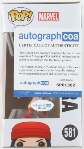 Funko Pop! vinyl figure measures 4″ in height and has been hand-signed on the original packaging by Jennifer Garner (Elektra).